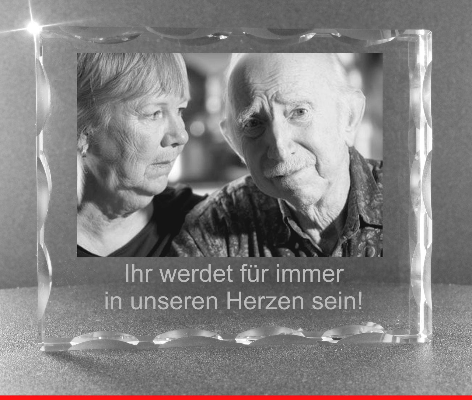 Wir gravieren Ihr Foto 1:1 wie wir es erhalten, mitten in das Glas! Die Oberfläche des Glases bleibt komplett unversehrt und Ihr Foto "schwebt" quasi im Glas.