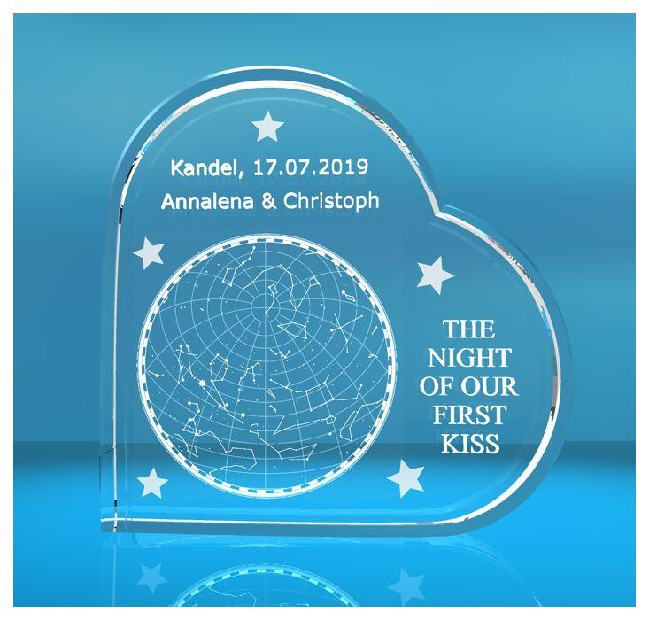 Hierzu wird euer Name, das Datum, der Ort, das zugehörige Sternenbild wie auch der Text "The night of our first kiss" eingraviert.