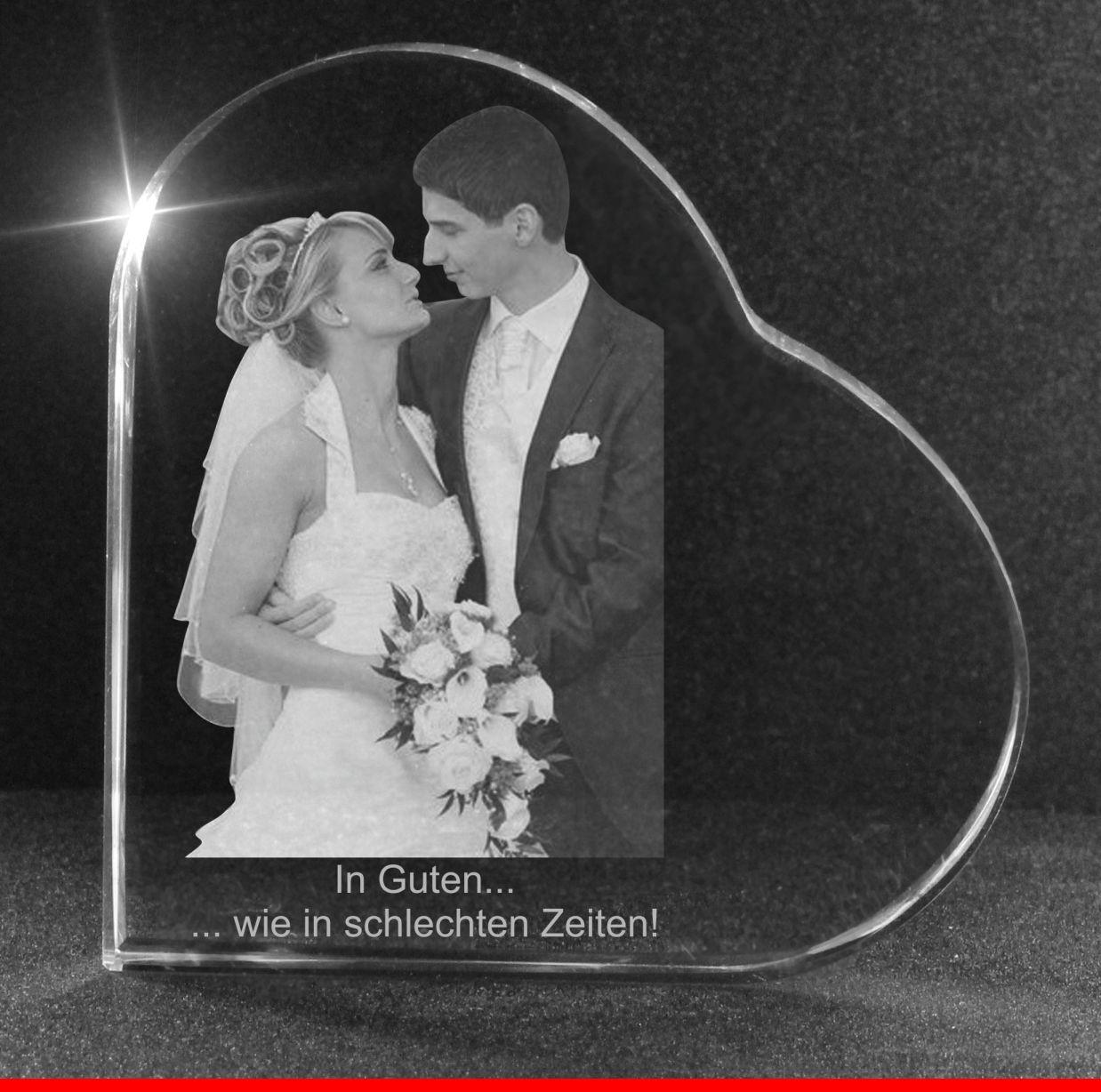 In dieses Glasherz werden Ihr Wunschfoto und Ihr Wunschtext kostenlos eingraviert - und zwar nicht wie bei den meisten Anbietern überlich auf das Glas, sondern bei uns direkt in das Glas! Somit ist Ihre Gravur gegen äußere Einflüsse geschützt und Sie haben sehr lange Freude daran.