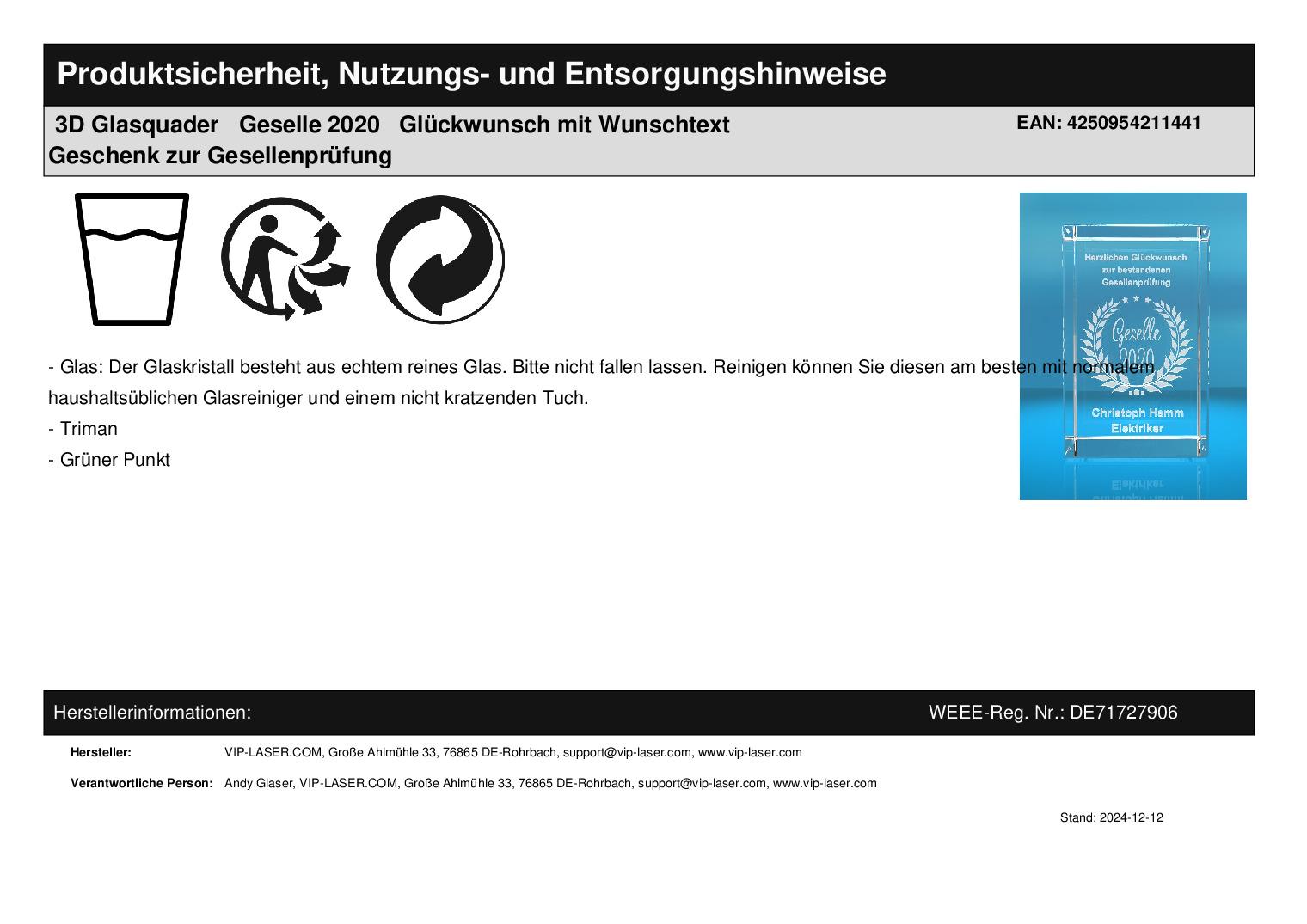 Eigenschaften "3D Glasquader Geselle 2020 Glückwunsch mit Wunschtext Geschenk zur Gesellenprüfung"