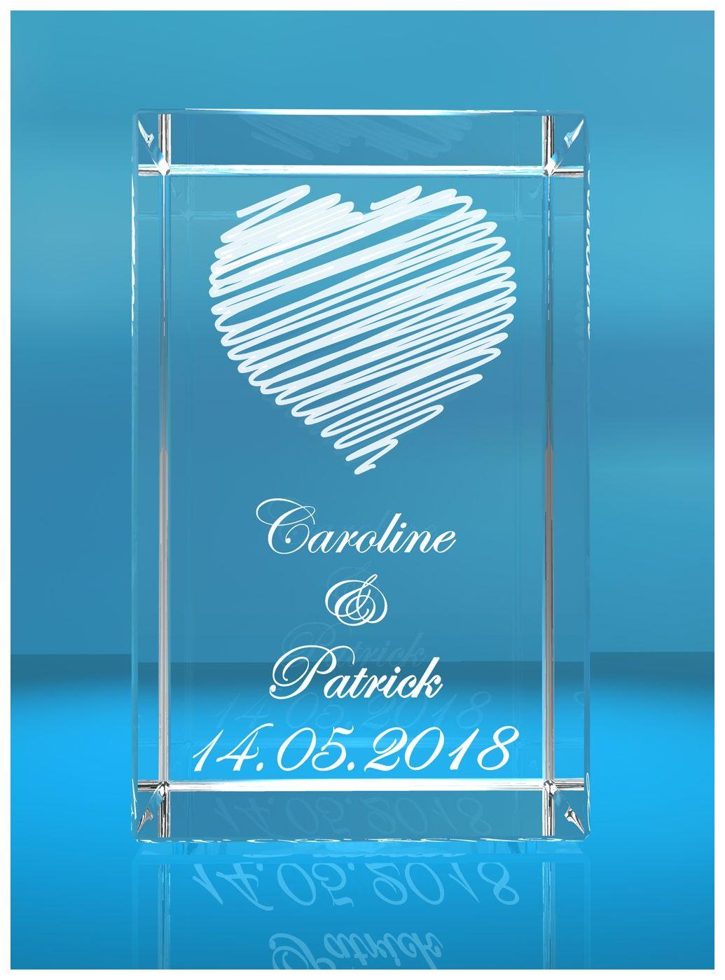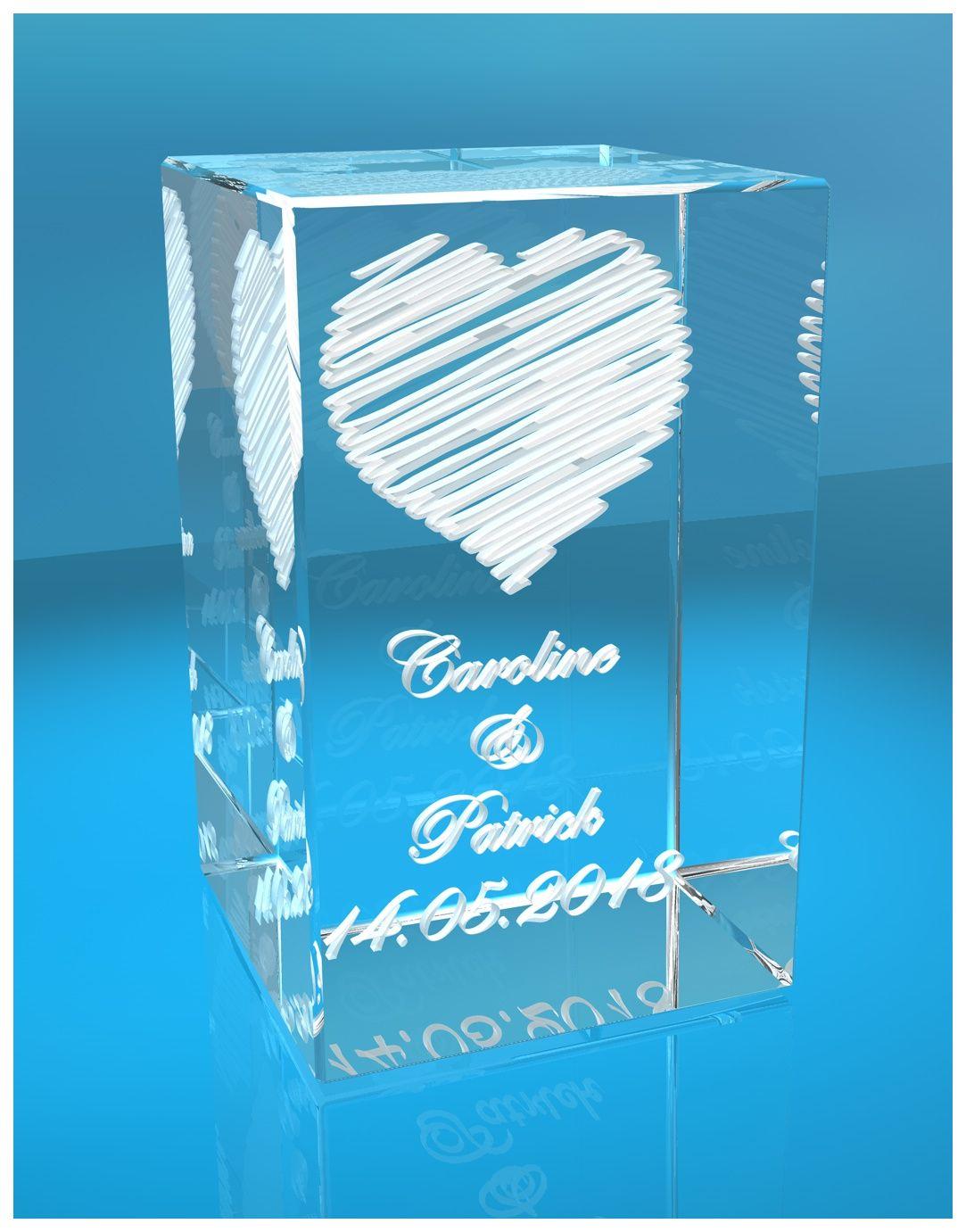 Zusätzlich werden Deine Namen + das Datum der Hochzeit, des Jahrestages oder ein kleiner Wunschtext in den Glaskristall eingraviert um dieses noch persönlicher und besonders zu machen.