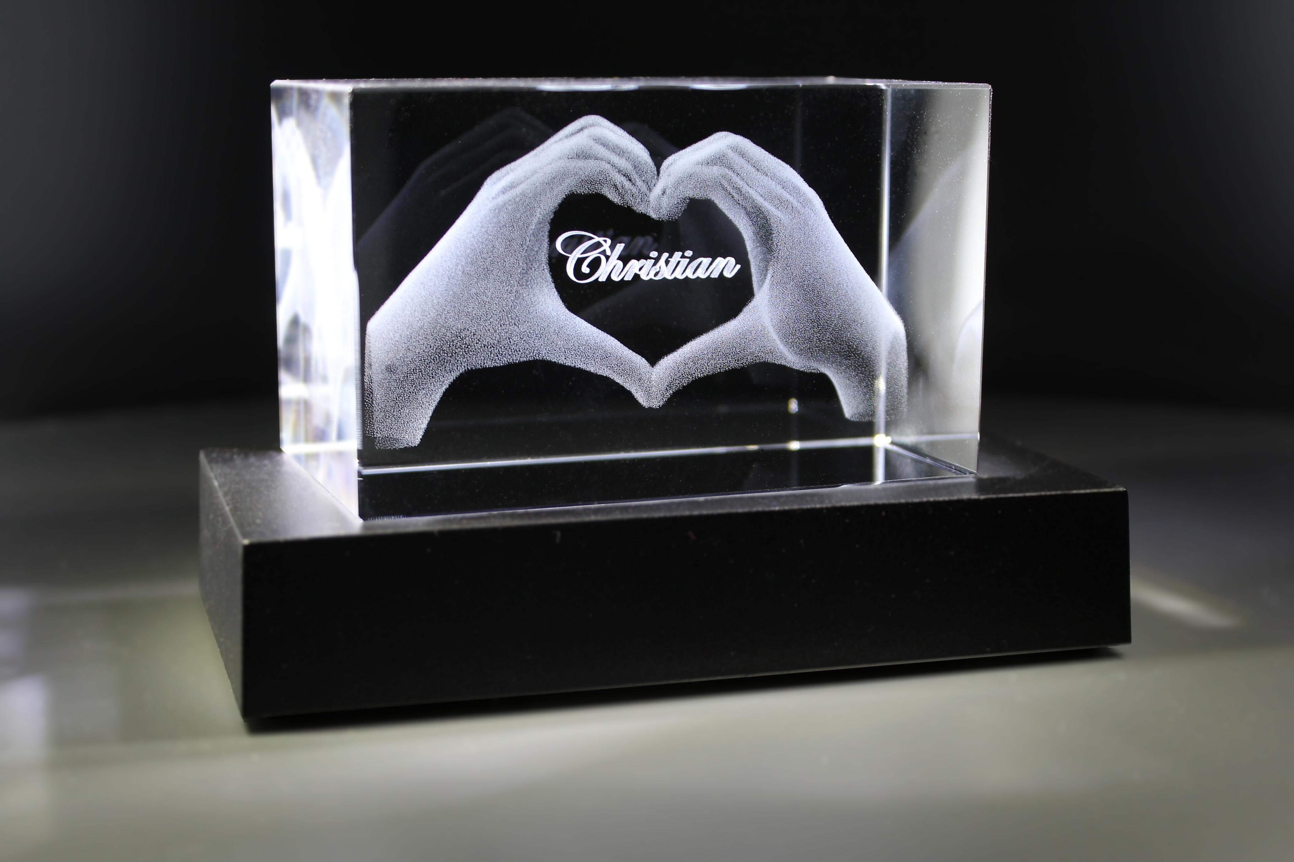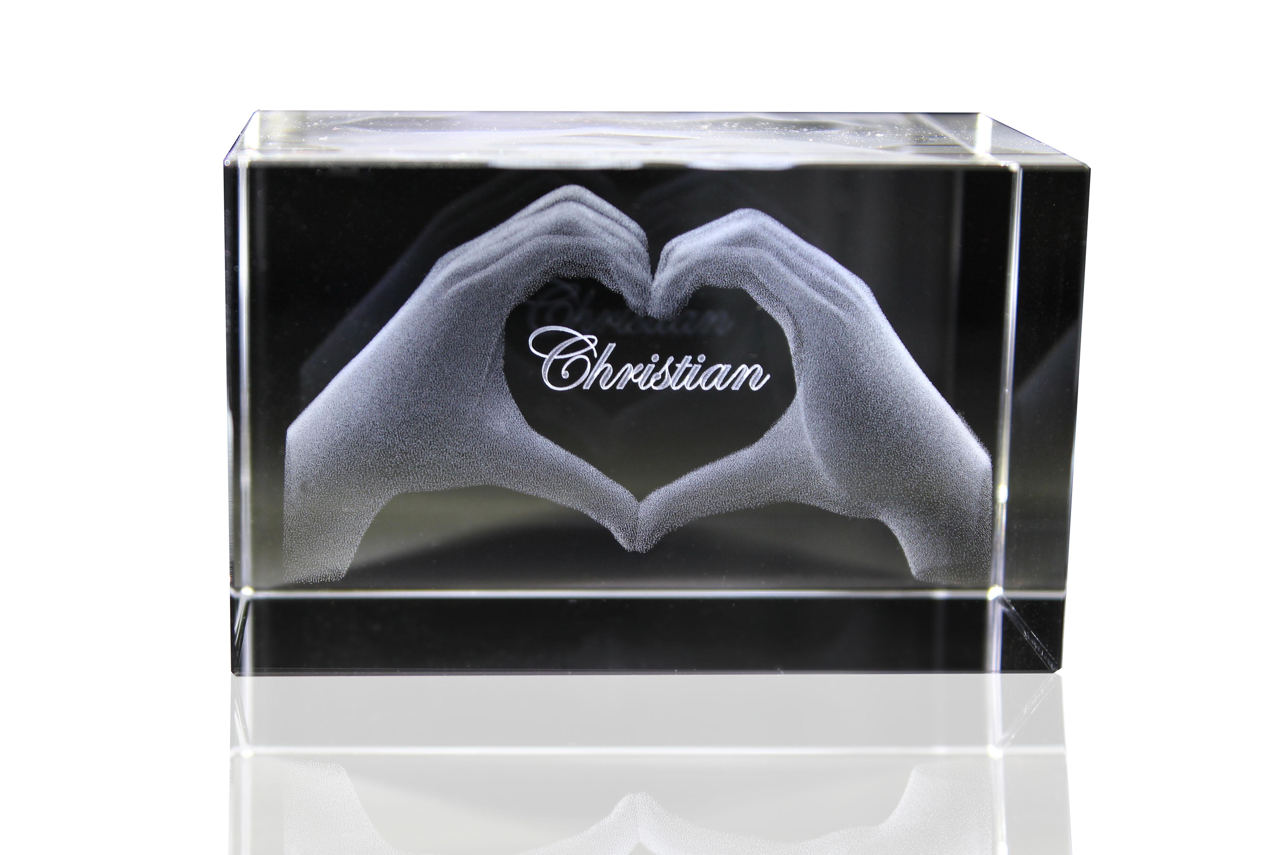 Produktinformationen "3D Glasquader I Herz aus zwei Händen mit Namen"