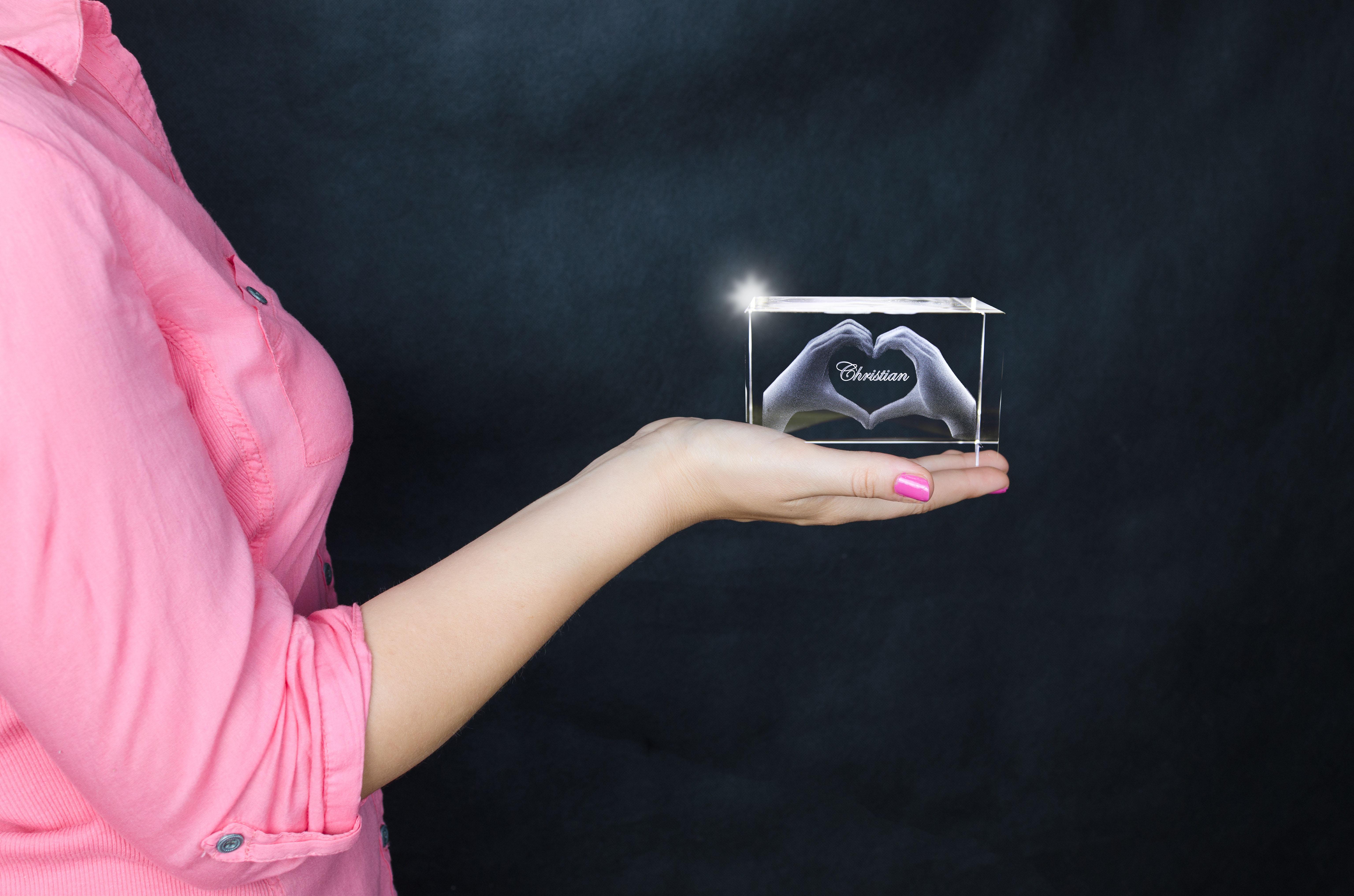 Produktinformationen "3D Glasquader I Herz aus zwei Händen mit Namen"
