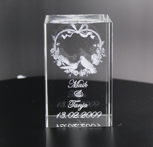 Zusätzlich werden Deine Namen + das Datum der Hochzeit, des Jahrestages oder ein kleiner Wunschtext in den Glaskristall eingraviert um dieses noch persönlicher und besonders zu machen.