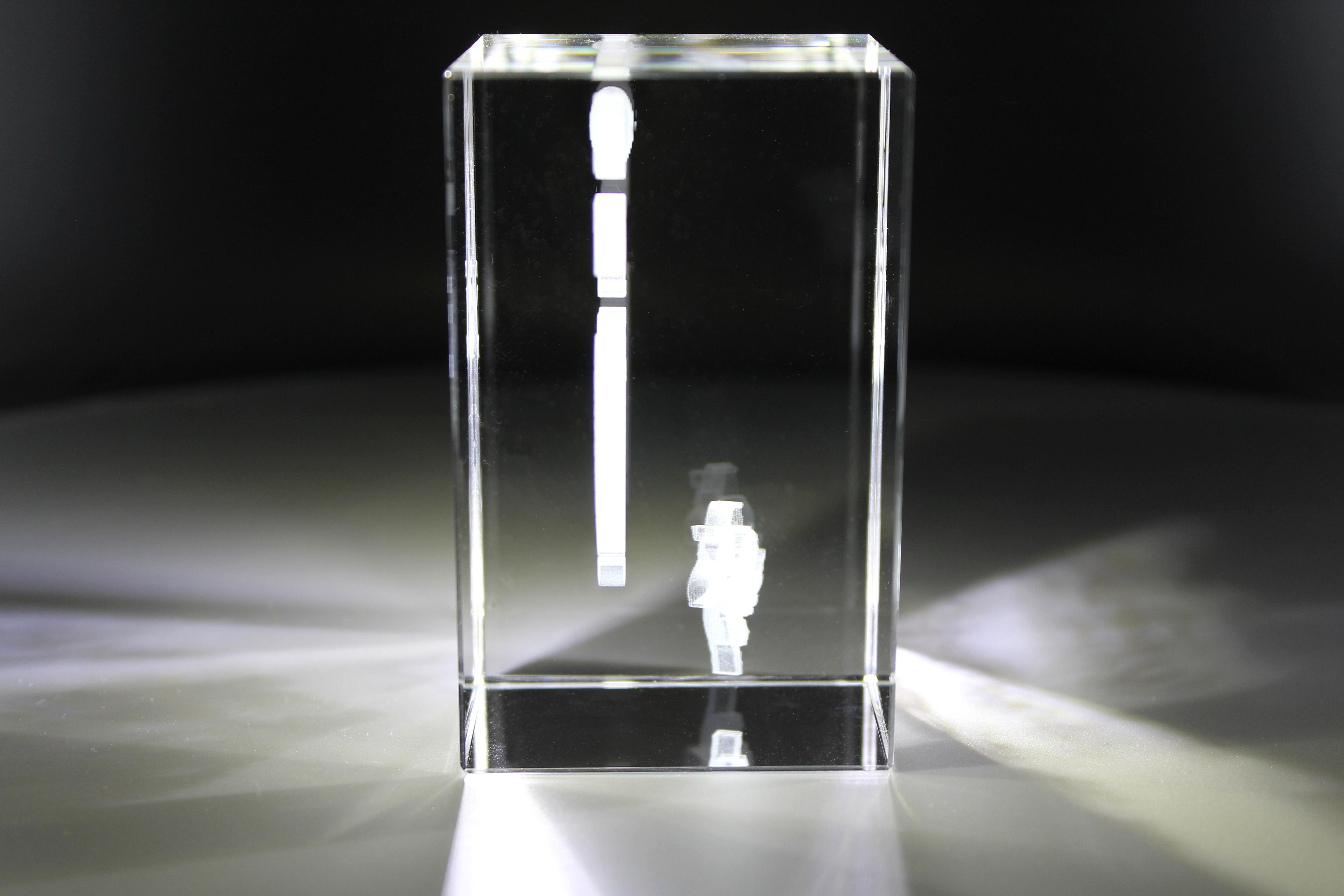 - 3D Glaskristall mit dem abgebildeten Motiv in den Abmessungen 80x50x50mm (Höhe x Breite x Tiefe)
