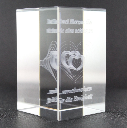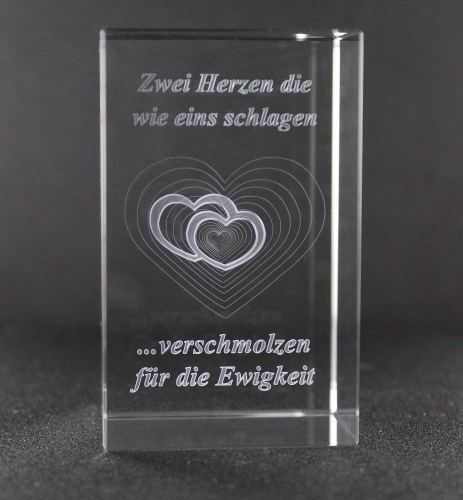 Eigenschaften "3D Glasquader I Text: Zwei Herzen die wie eins schlagen... verschmolzen für die Ewigkeit"