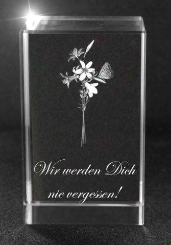 Eigenschaften "3D Glasquader Lilien Text: Wir werden Dich nie vergessen!"