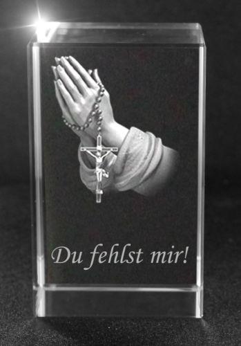 Eigenschaften "3D Glasquader Motiv: Betende Hände Text: Du fehlst mir!"