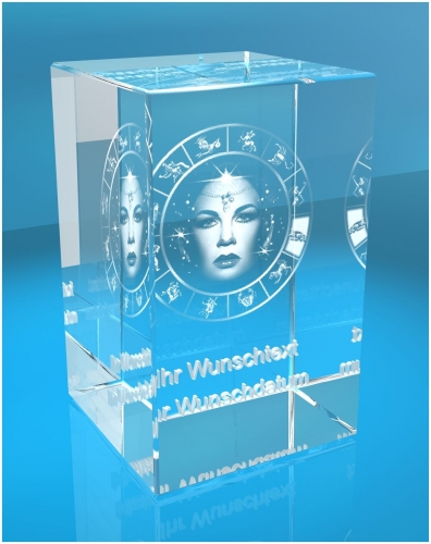 Eigenschaften "3D Glasquader Motiv: Sternzeichen Jungfrau + Wunschtext"