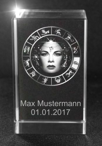 3D Glasquader Motiv: Sternzeichen Jungfrau + Wunschtext