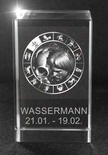 Eigenschaften "3D Glasquader Motiv: Sternzeichen Wassermann + Wunschtext"