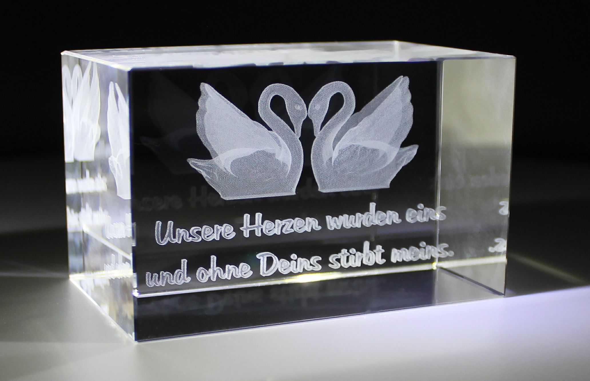 Eigenschaften "3D Glasquader Zwei Schwäne Unsere Herzen wurden eins, doch ohne Dich stirbt meins"