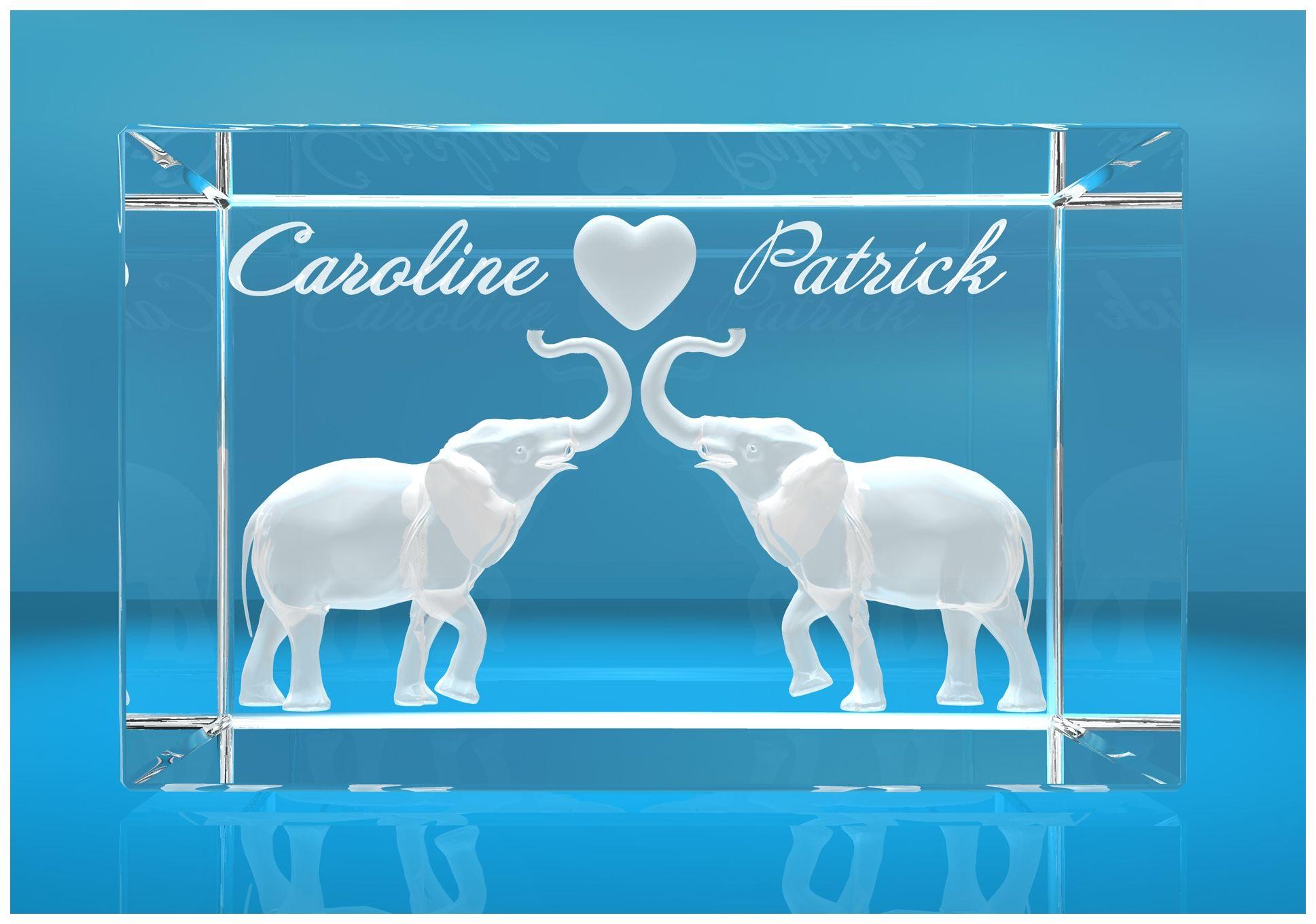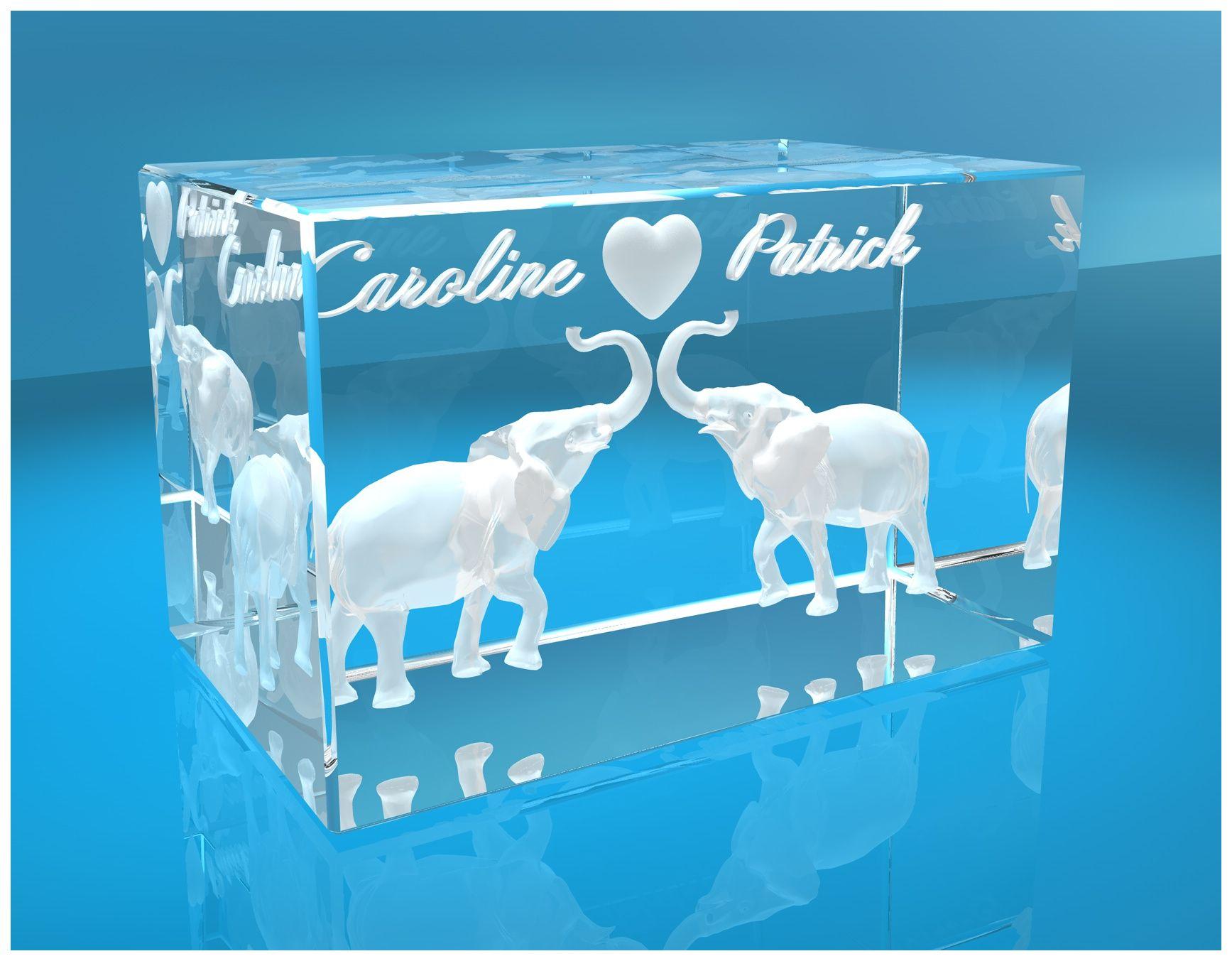 Produktinformationen "3D Glasquader verliebte Elefanten mit Herz in 3D und zwei Wunschnamen Geschenk für den Partner die Partnerin zum Valentinstag Jahrestag Hochzeit"