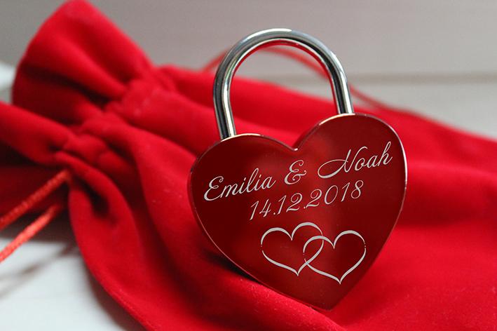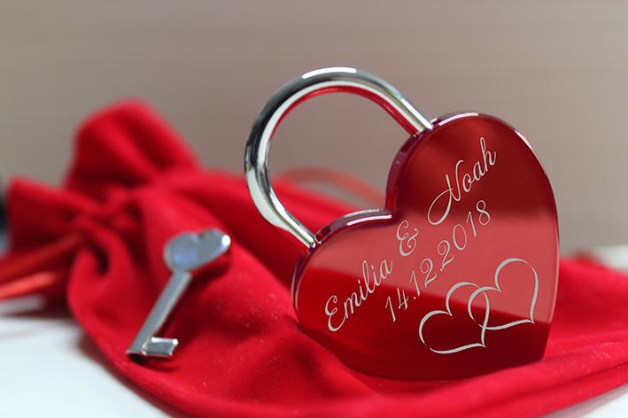 Unsere Liebesschlösser aus Metall, Rot glänzend eloxiert mit einem Schlüssel bestechen durch eine hohe Qualität und werden detailreich von uns mit Ihrem Wunsch-Motiv und den Daten graviert.