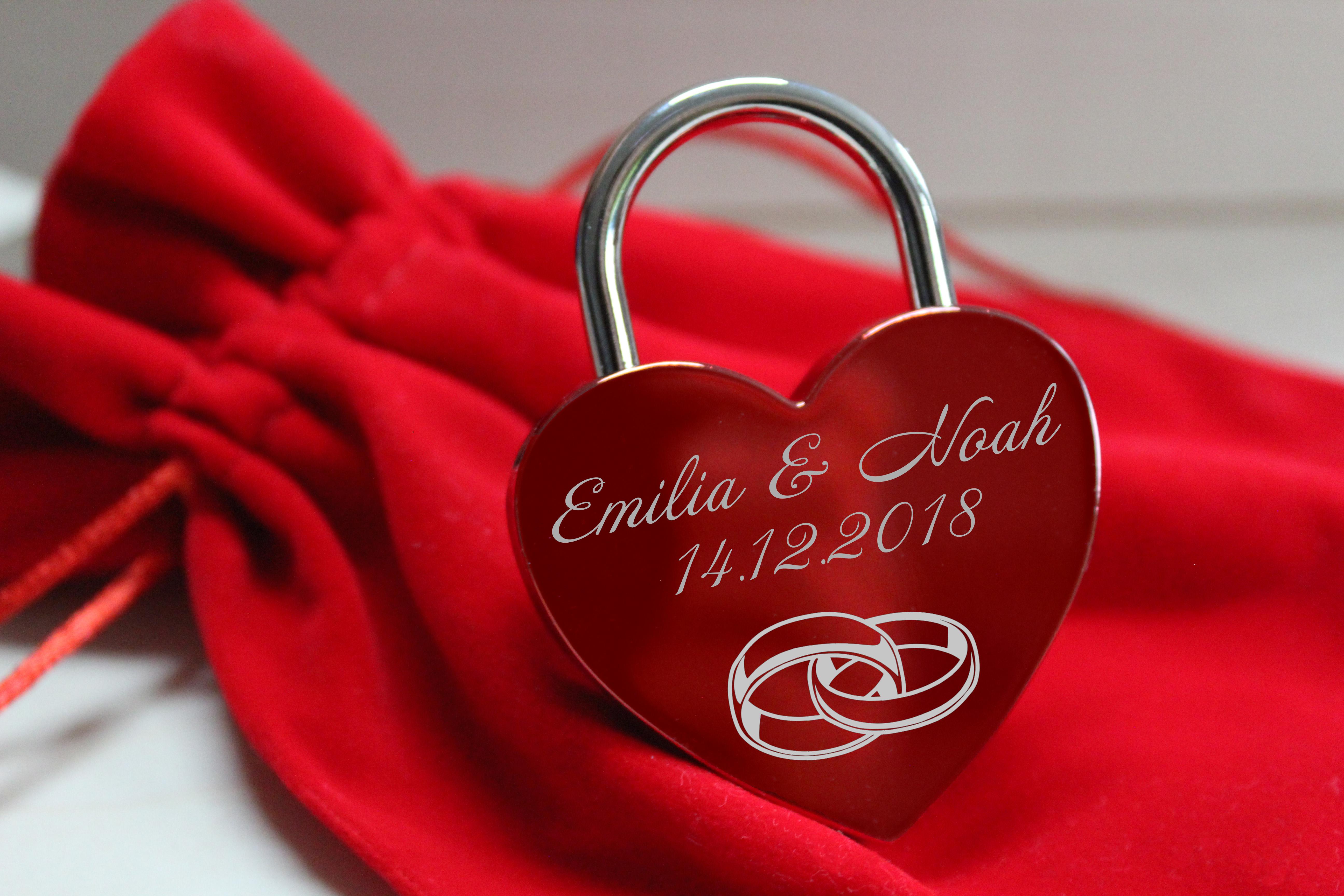 Unsere Liebesschlösser aus Metall, Rot glänzend eloxiert mit einem Schlüssel bestechen durch eine hohe Qualität und werden detailreich von uns mit Ihrem Wunsch-Motiv und den Daten graviert.