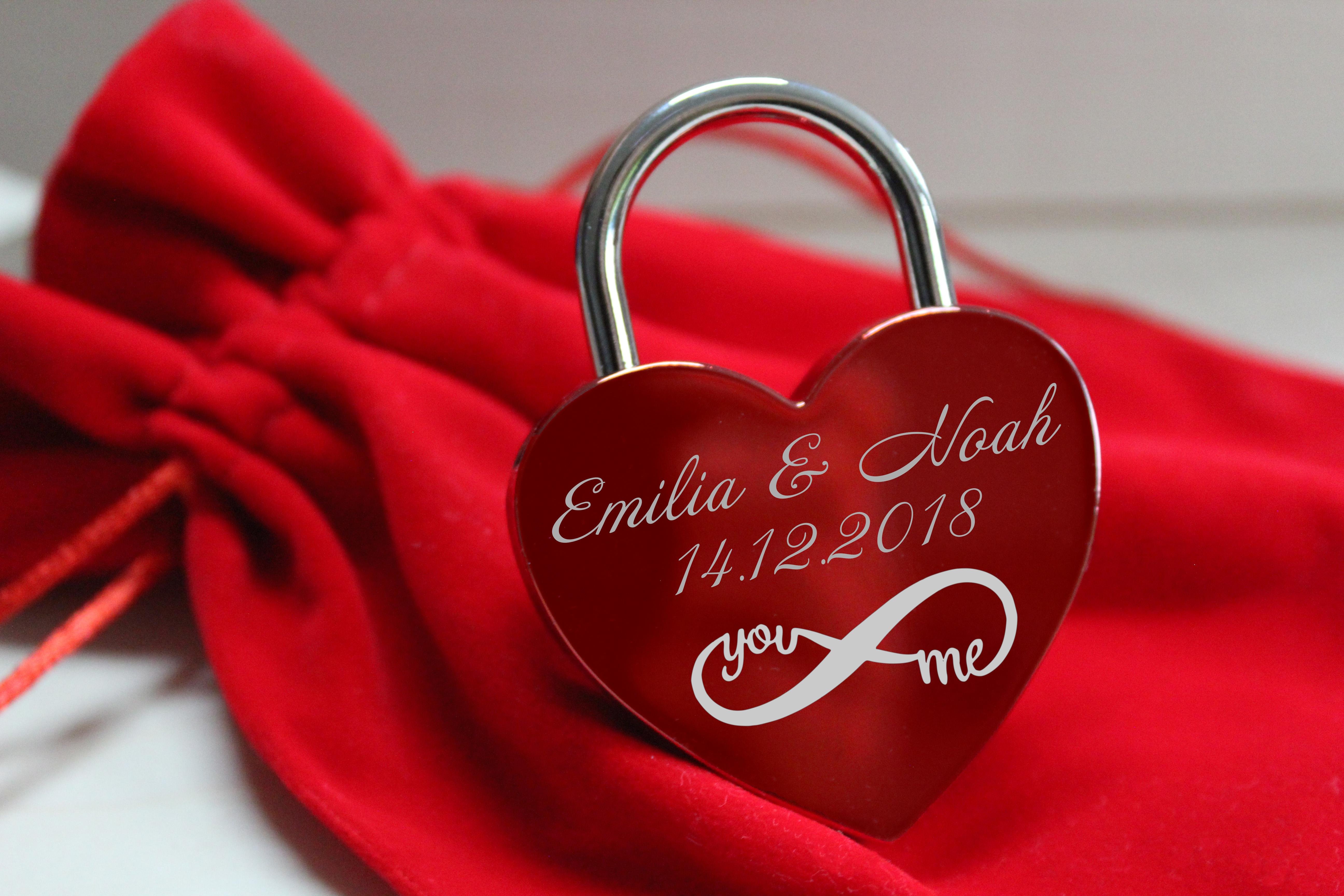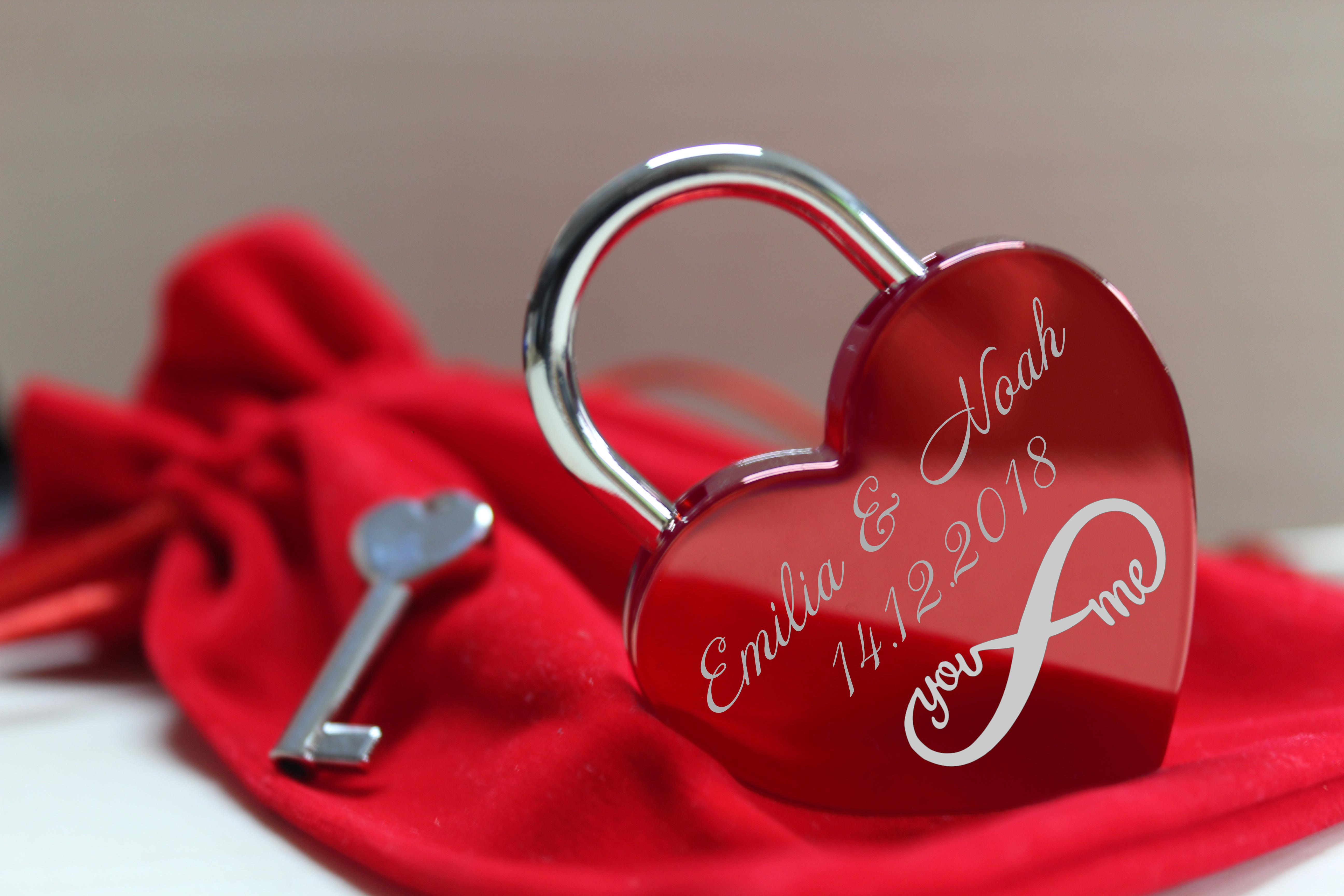 Unsere Liebesschlösser aus Metall, Rot glänzend eloxiert mit einem Schlüssel bestechen durch eine hohe Qualität und werden detailreich von uns mit Ihrem Wunsch-Motiv und den Daten graviert.