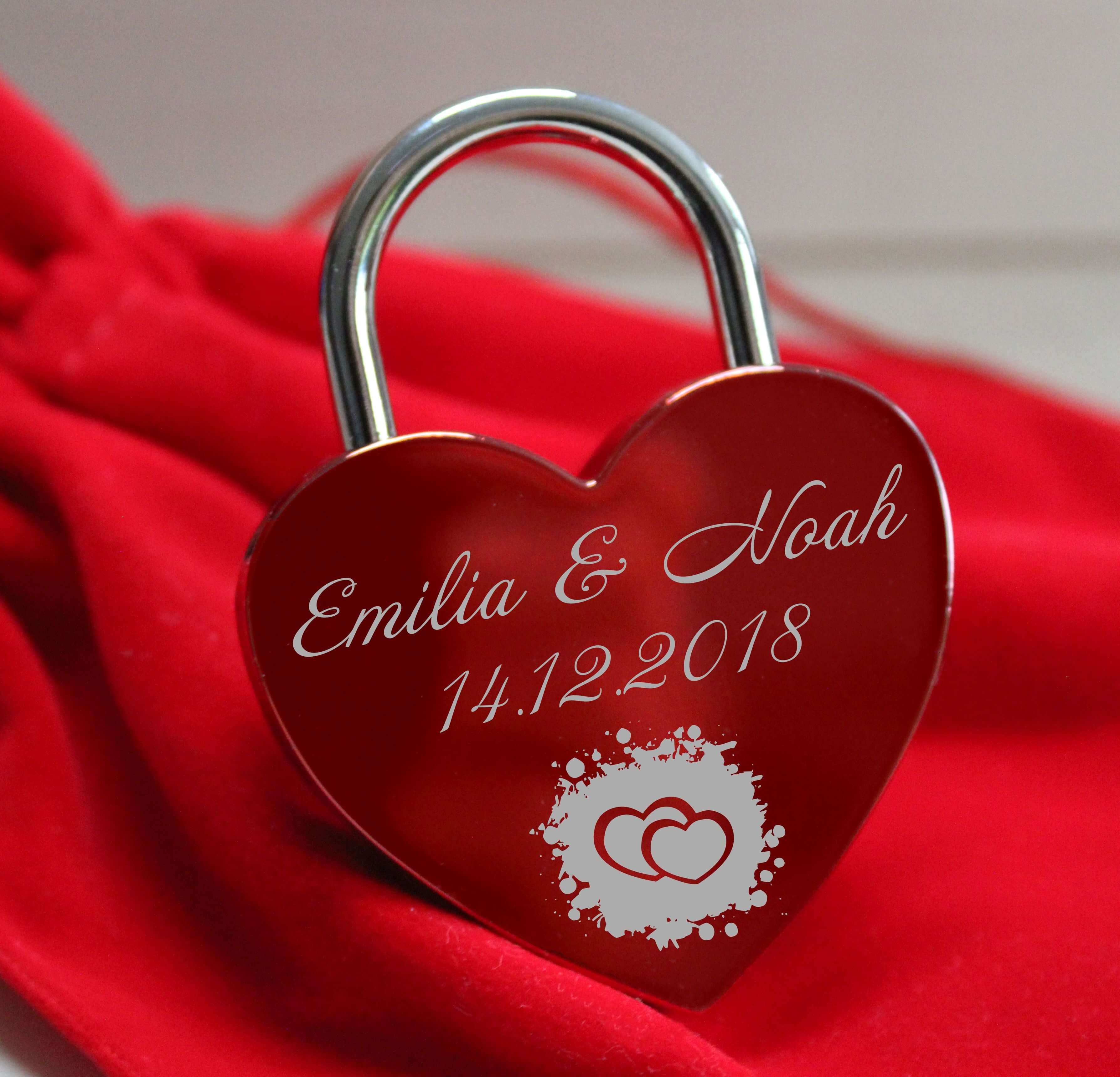 Unsere Liebesschlösser aus Metall, Rot glänzend eloxiert mit einem Schlüssel bestechen durch eine hohe Qualität und werden detailreich von uns mit Ihrem Wunsch-Motiv und den Daten graviert. Wir liefern das Schloss in einem schönen hochwertigen Samtsäckchen als Geschenkverpackung, somit eignet sich das Produkt hervorragend zum weiterverschenken. Setzen Sie ein Zeichen Ihrer unendlichen Liebe mit einem Liebessschloss welches Sie in einem Kurztrip oder im Urluab an einem schönen Ort aufhängen. Sie erhalten: Hochwertiges Liebesschloss aus Metall, Rot EloxiertDetailreiche Gravur einseitig (auf der Rückseite des Schlosses)Die Maße der gravierbaren Fläche des Herzes beim Liebesschloss sind ca. 45x35 mm - die Gesamtgröße incl. Bügel beträgt ca. 60x45mm.