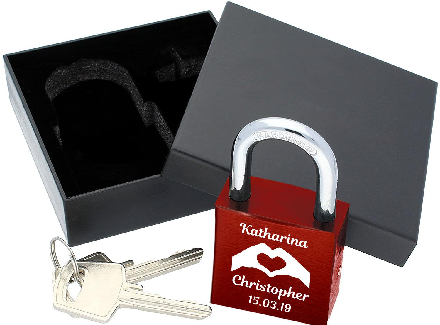 Das Liebesschloss in der Farbe Rot wird mit unseren Lasern mit Deinen Angaben graviert. Wir gravieren Deinen Namen + Datum oder kleinen Wunschtext zu dem bestehenden Motiv ein.