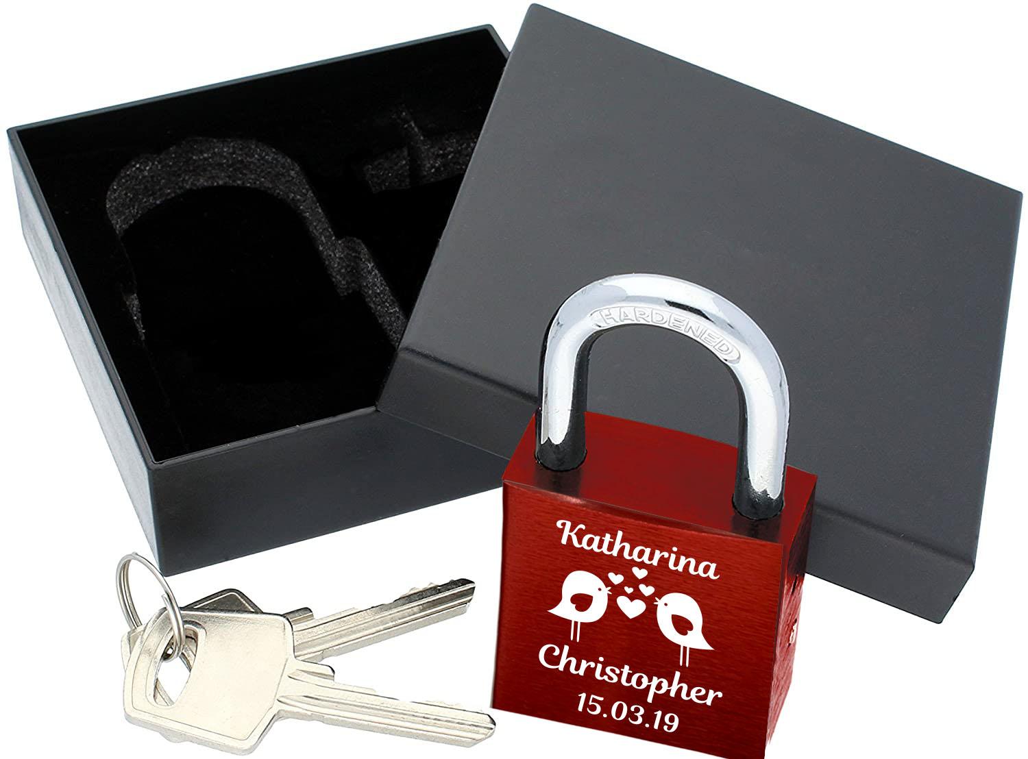 Das Liebesschloss in der Farbe Rot wird mit unseren Lasern mit Deinen Angaben graviert. Wir gravieren Deinen Namen + Datum oder kleinen Wunschtext zu dem bestehenden Motiv ein.