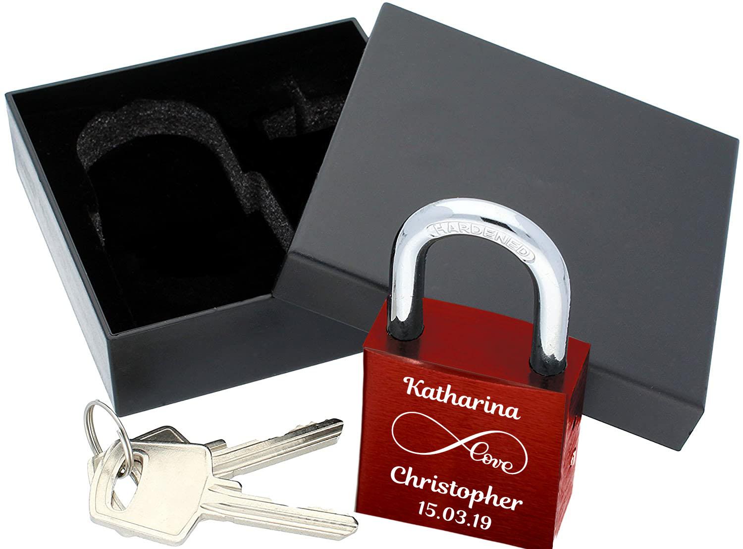 Das Liebesschloss in der Farbe Rot wird mit unseren Lasern mit Deinen Angaben graviert. Wir gravieren Deinen Namen + Datum oder kleinen Wunschtext zu dem bestehenden Motiv ein.