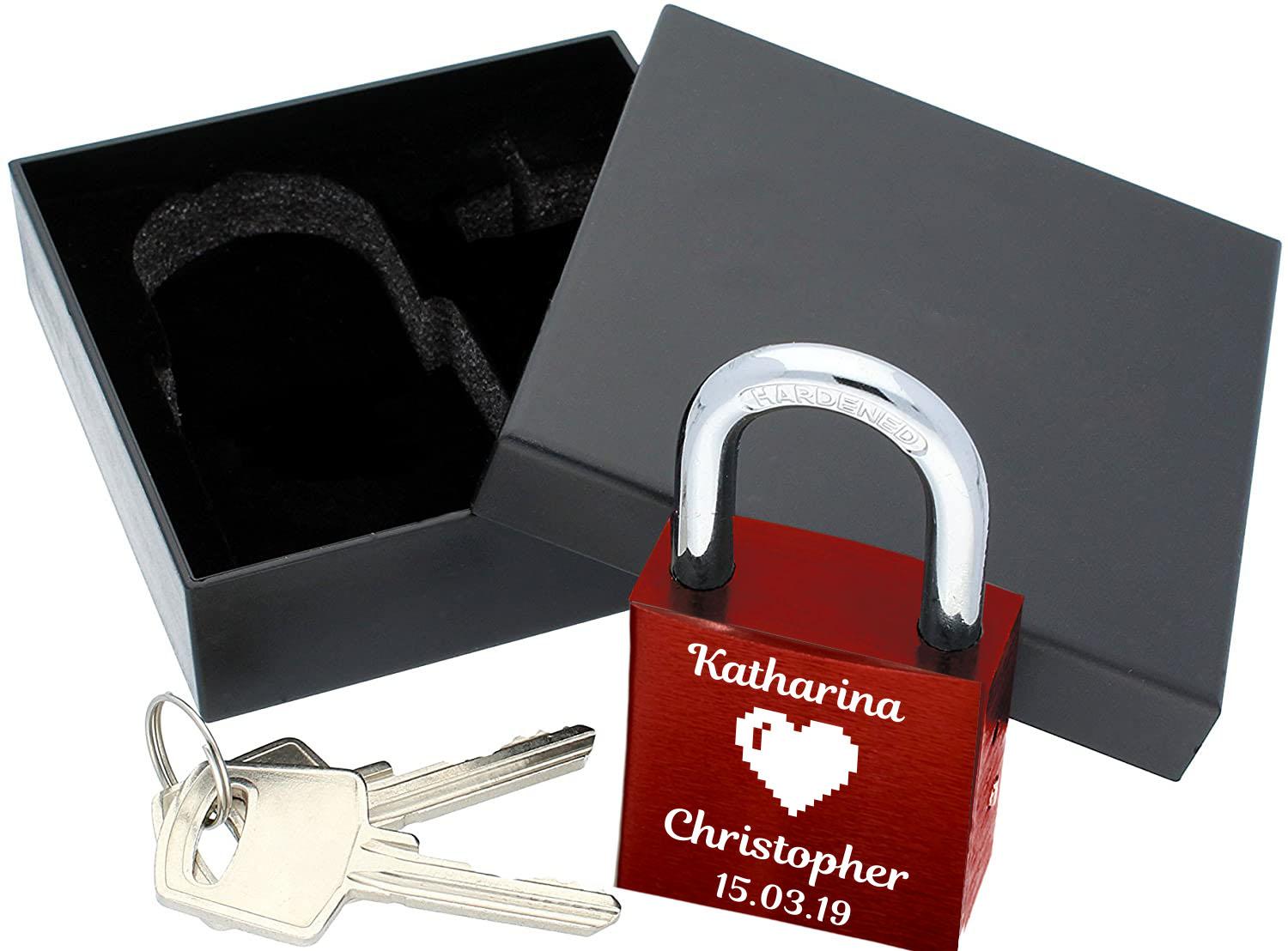 Produktinformationen "POD Liebesschloss mit Deinem Namen, Datum und Verzierung mit Herzen! Farbe: Rot Motiv: M012"