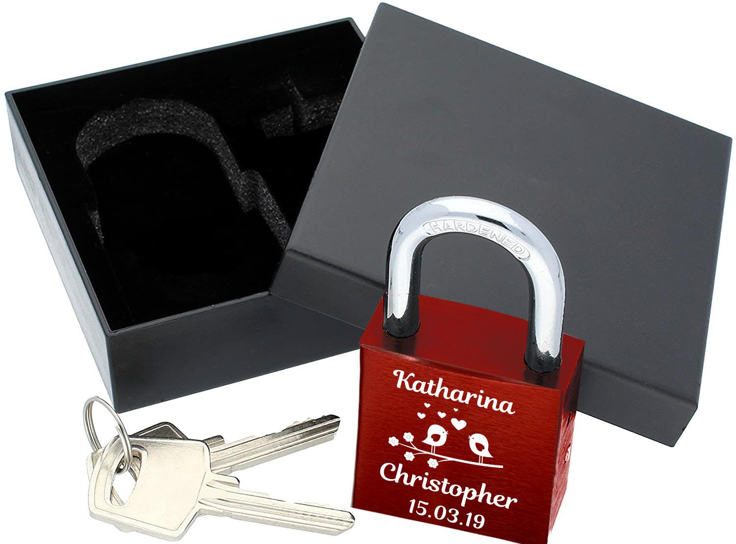 Das Liebesschloss in der Farbe Rot wird mit unseren Lasern mit Deinen Angaben graviert. Wir gravieren Deinen Namen + Datum oder kleinen Wunschtext zu dem bestehenden Motiv ein.