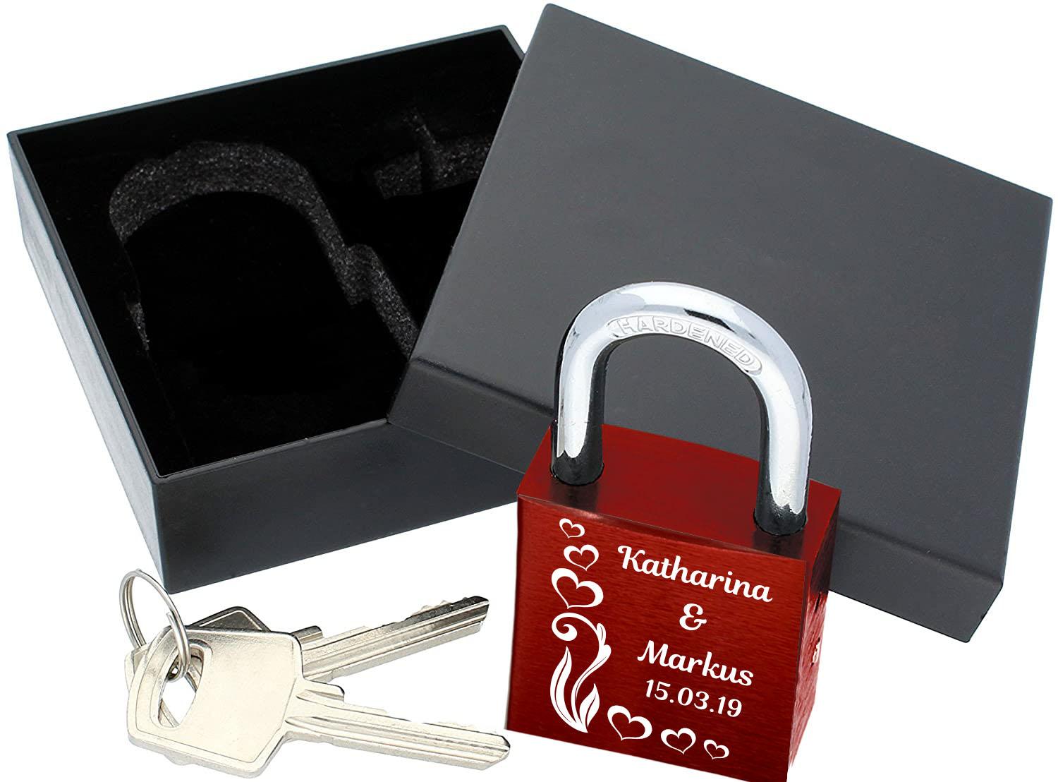 Produktinformationen "POD Liebesschloss mit Deinem Namen, Datum und Verzierung mit Herzen! Farbe: Rot Motiv: M017"