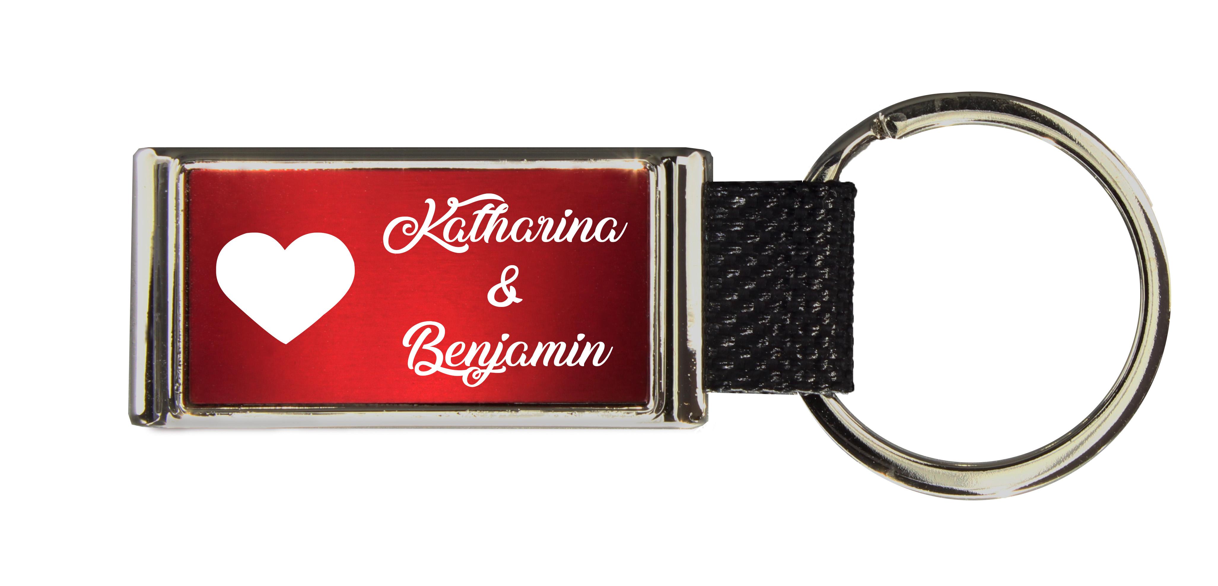 Metall-Schlüsselanhänger Glory - mit einem eingelassenen roten Plättchen (symbolisiert das Zeichen der Liebe) und dem im Artikelfoto angezeigten Motiv und Deinen Wunschnamen graviert
