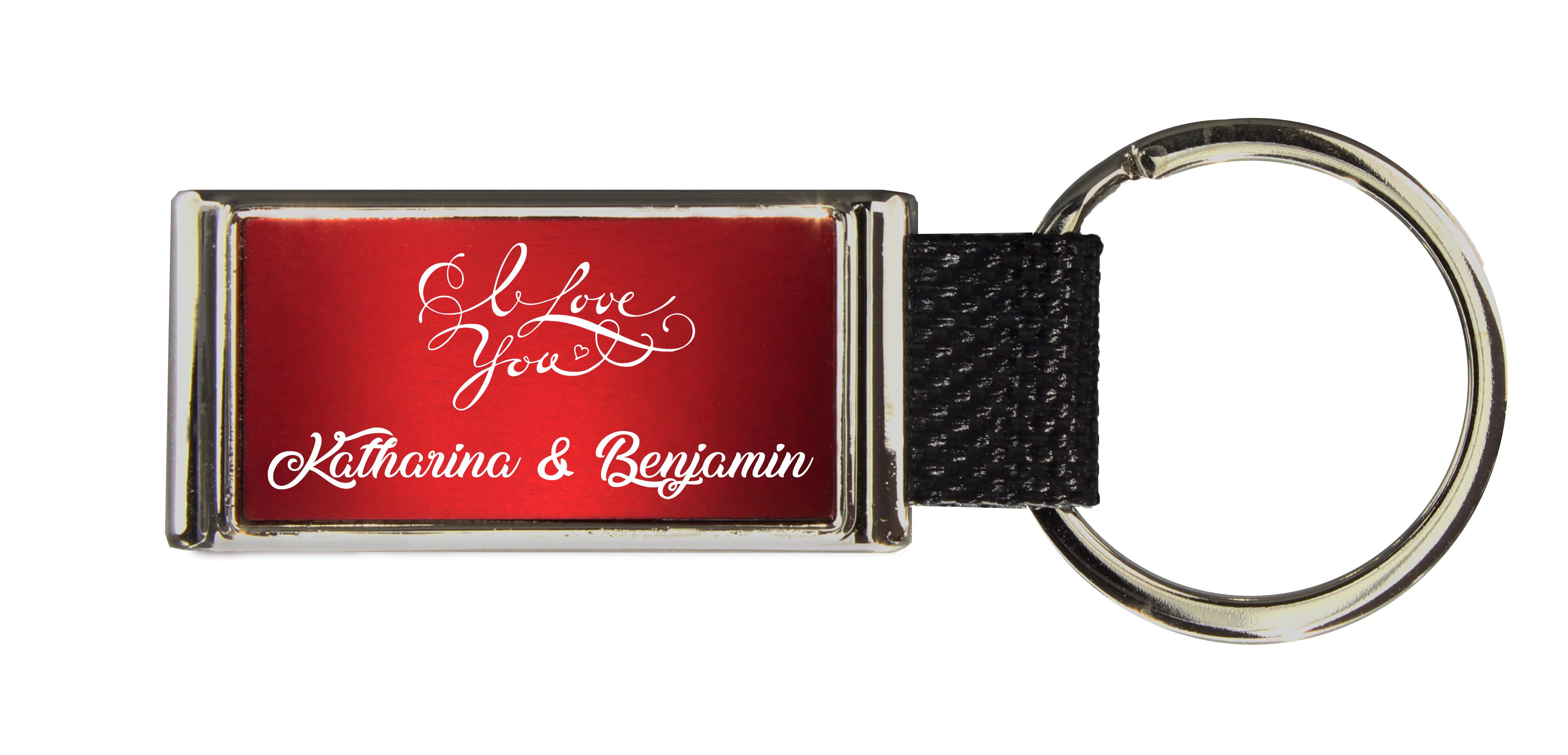 Metall-Schlüsselanhänger Glory - mit einem rot eingelassenen Plättchen und Deinen Wunschnamen graviert