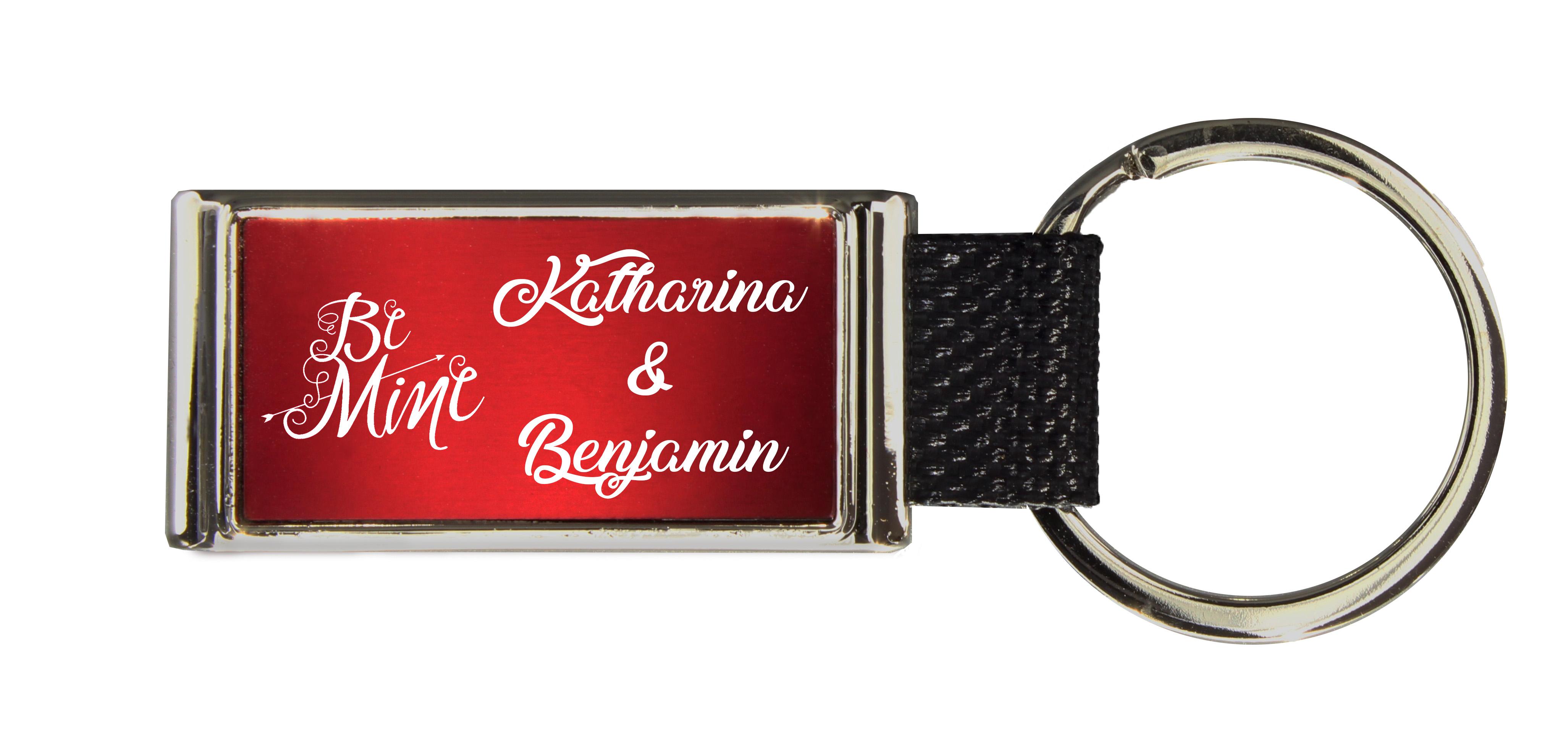 Metall-Schlüsselanhänger Glory - mit einem rot eingelassenen Plättchen und Deinen Wunschnamen graviert